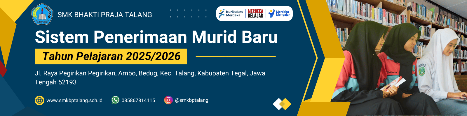 Selamat Datang di Website Sistem Penerimaan Murid Baru (SPMB) SMK Bhakti Praja Talang. Kami membuka pendaftaran peserta didik baru untuk Tahun Ajaran 2025 - 2026 mulai tanggal 6 Januari 2025 dengan beberapa jalur pendaftaran.